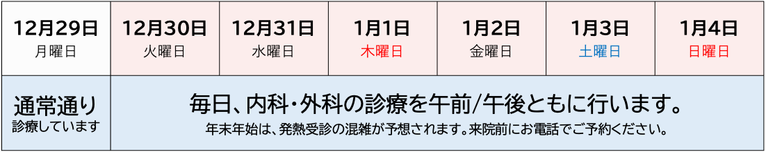 年末年始は混雑が予想されますので、受診前にお電話でのお問い合わせをおすすめします。